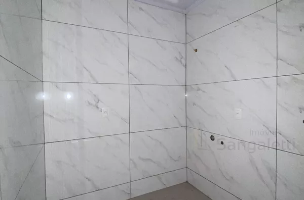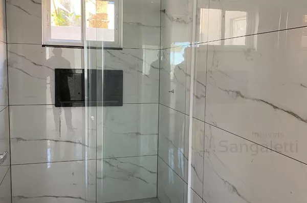 O banheiro social atende às necessidades da casa com praticidade, e a lavanderia é equipada com uma churrasqueira, oferecendo um espaço perfeito para confraternizações e momentos especiais.